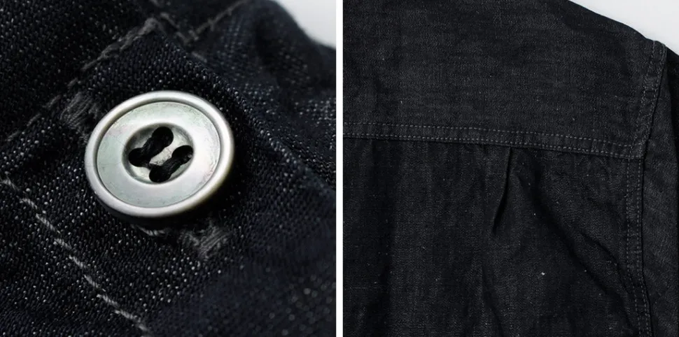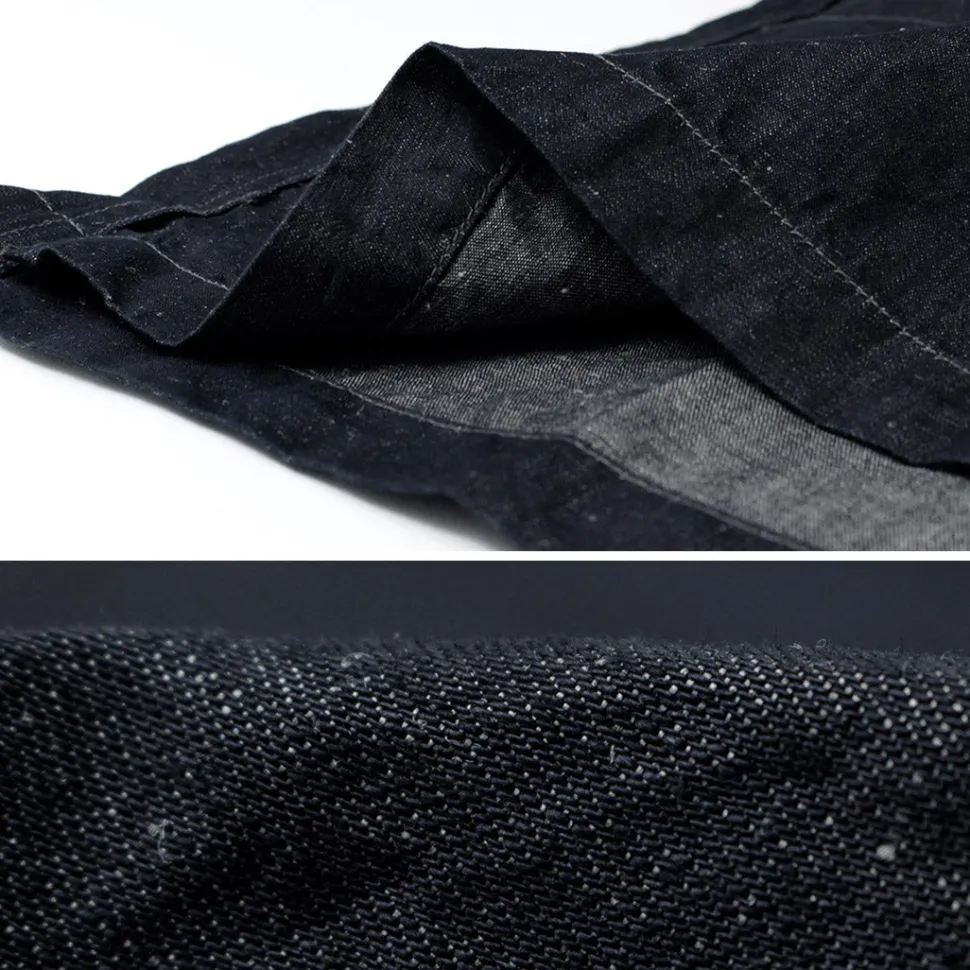 BLACK LAND HEMP DENIM is a hemp-blend denim fabric. A robust fabric with a smooth feel, thin but firm sturdiness and bounce. The surface has a slight sheen, giving it an elegant atmosphere despite being denim.