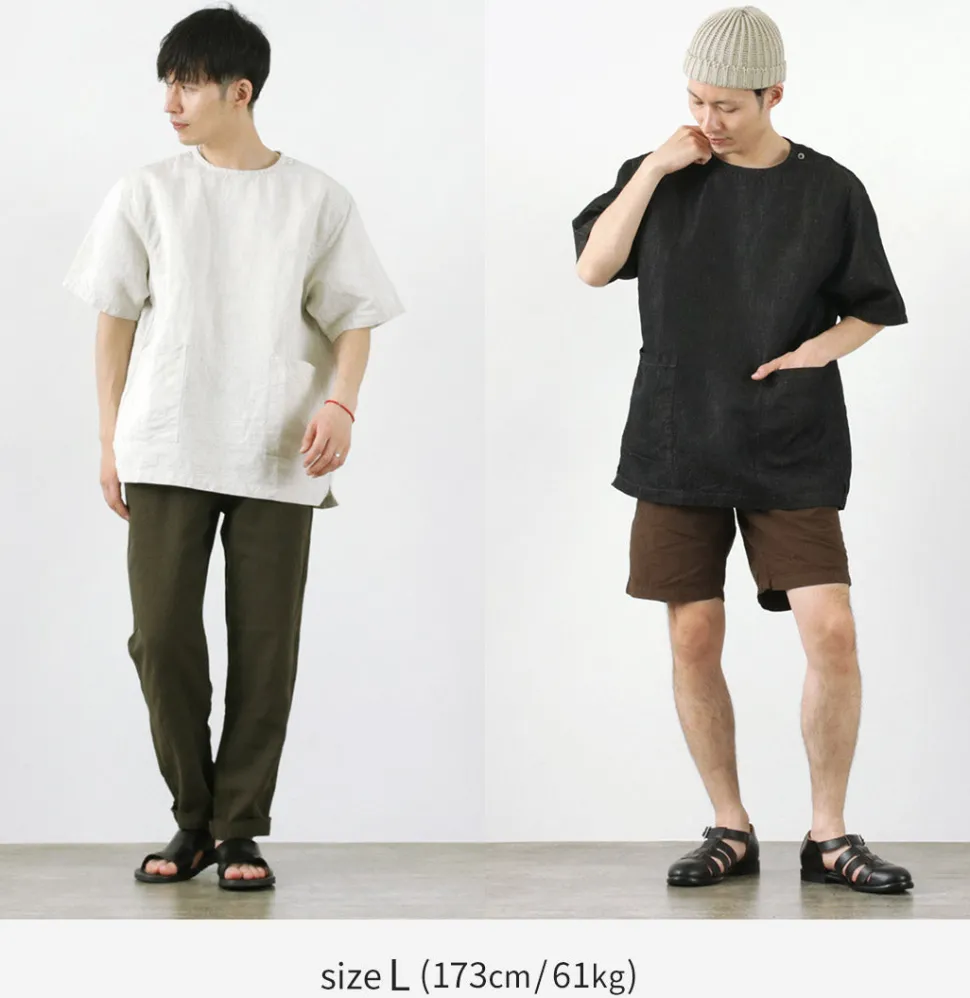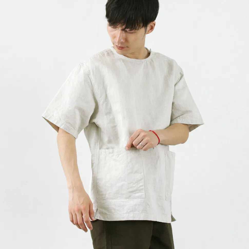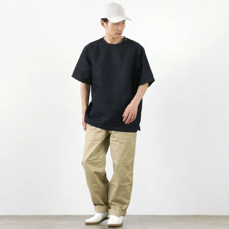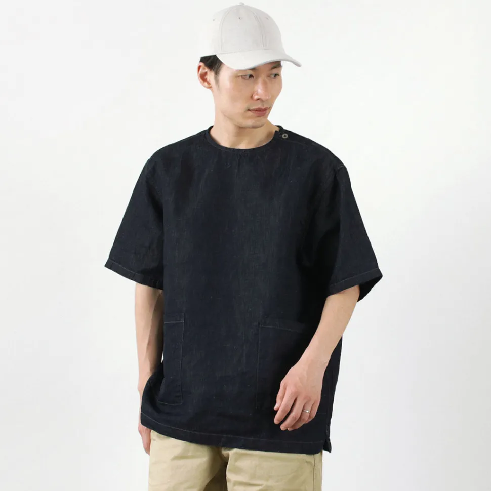 This short-sleeved shirt is based on a Romanian army sleeping shirt and finished in hemp-blend denim. It is produced in a simple T-shirt shape to make the most of the fabric’s qualities.