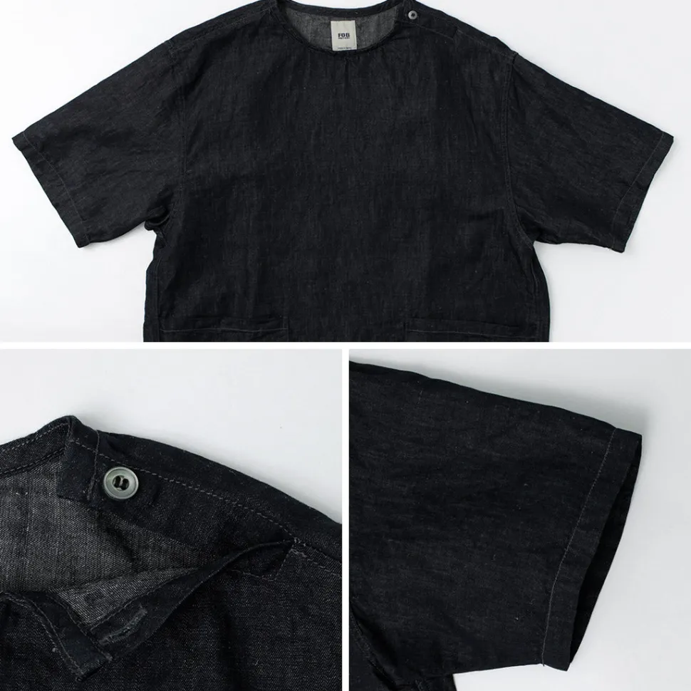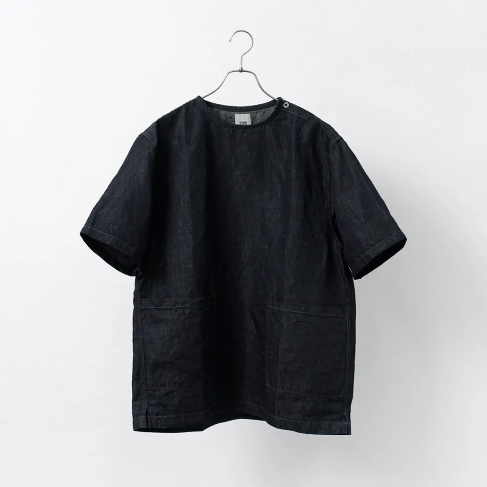 This short-sleeved shirt is based on a Romanian army sleeping shirt and finished in hemp-blend denim. Made in a simple T-shirt shape to make the most of the fabric’s qualities.