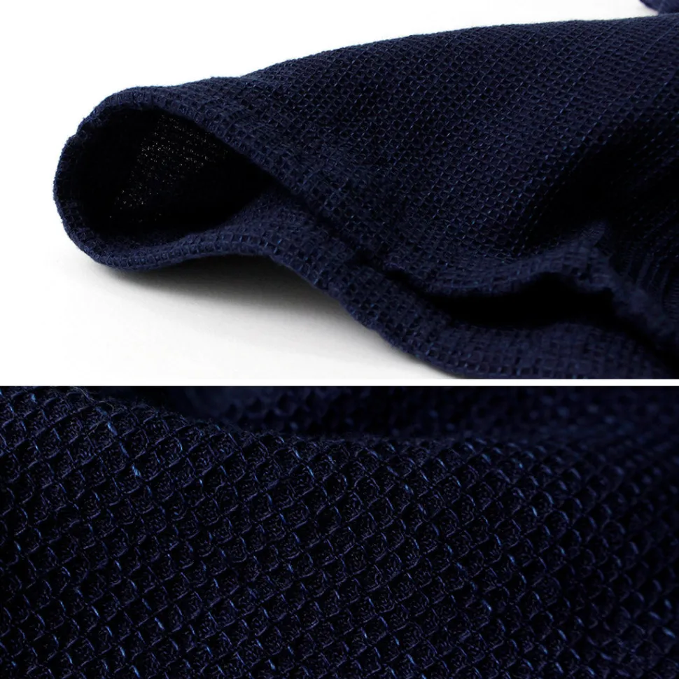 The fabric is indigo-dyed waffle dobby denim. It has an uneven, thermal-like texture, but because it is a woven fabric, there is no worry about it stretching like a thermal.