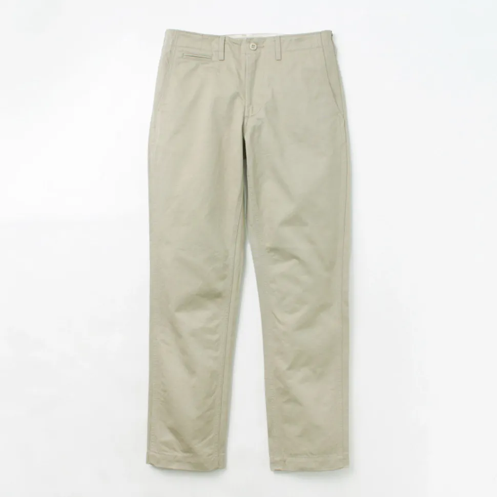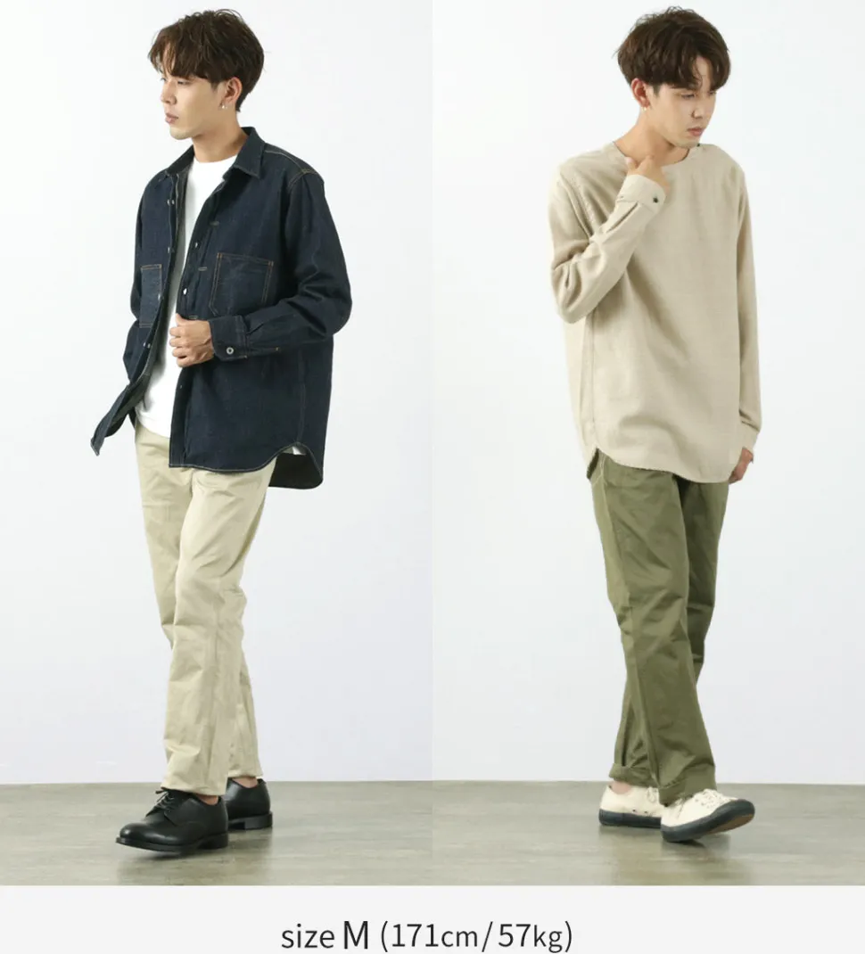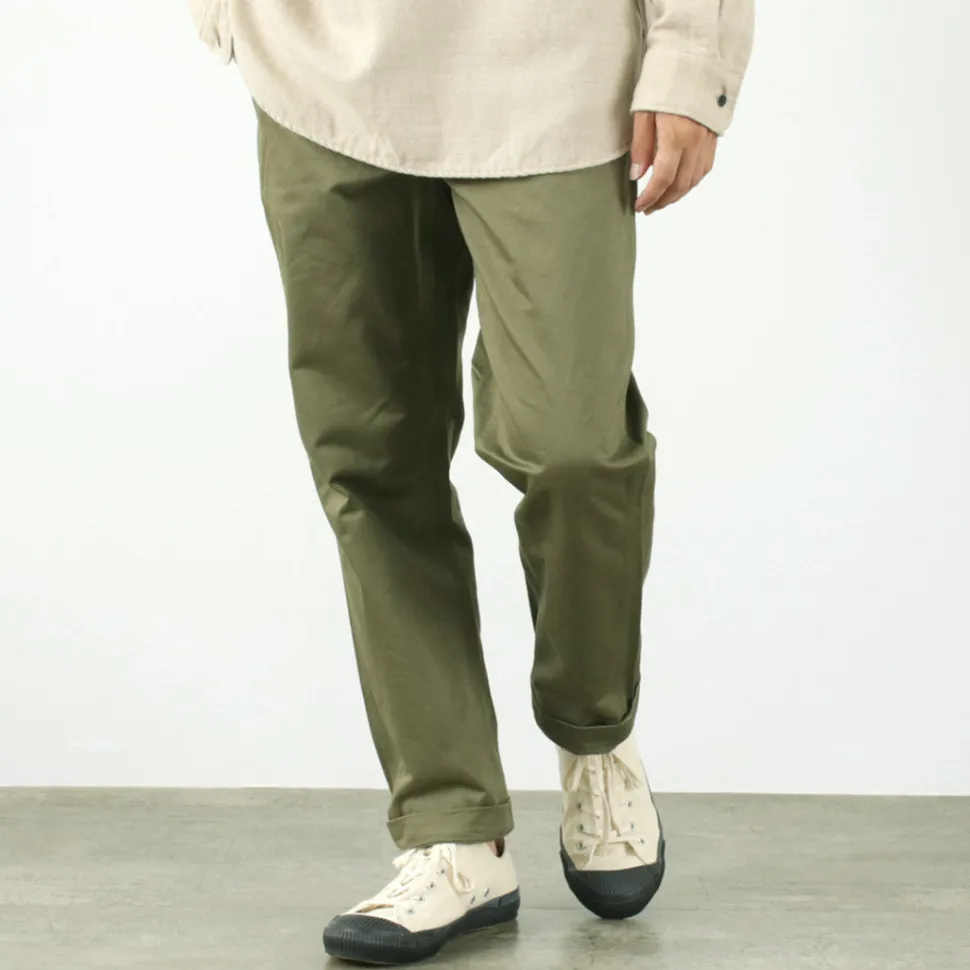 Based on the U.S army Chino trousers, details such as the ball-rimmed pockets and rolled seams are reproduced and fused with a slim, clean silhouette that is typical of F.O.B FACTORY. A brand new pair that can be worn with any outfit.