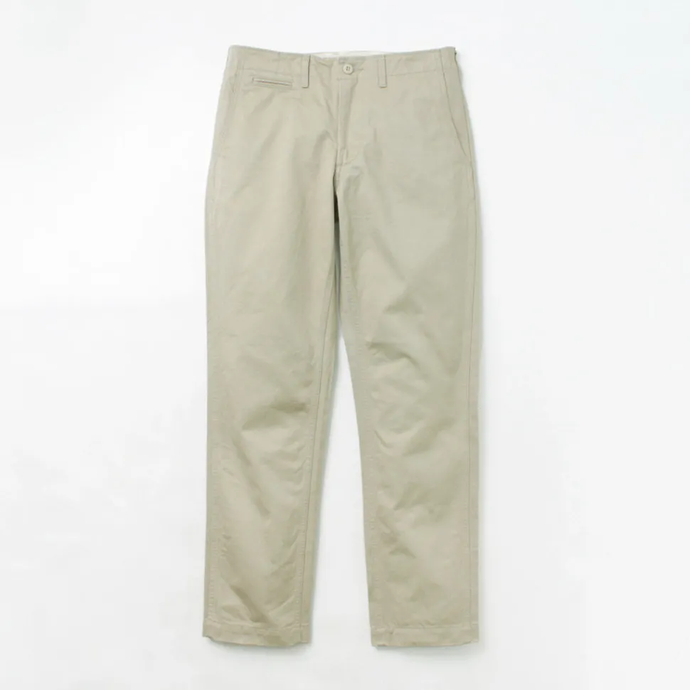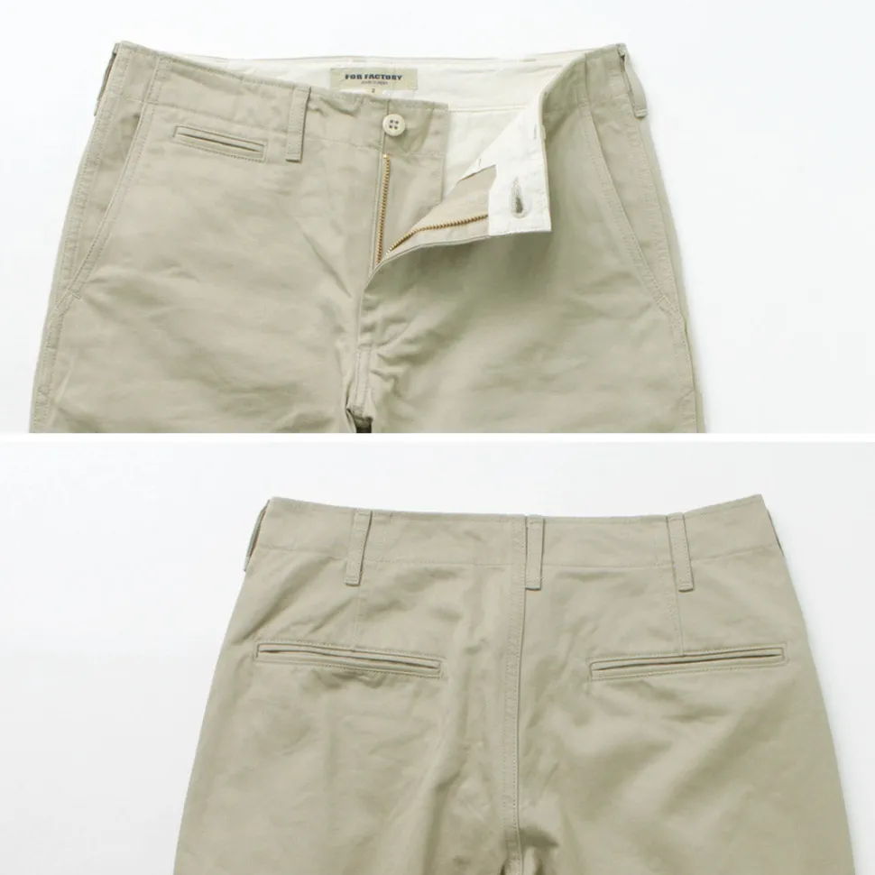 Based on the U.S army Chino trousers, details such as ball-rimmed pockets and rolled seams are reproduced and fused with a slim, clean silhouette typical of F.O.B FACTORY. A brand new pair that can be worn with any outfit.