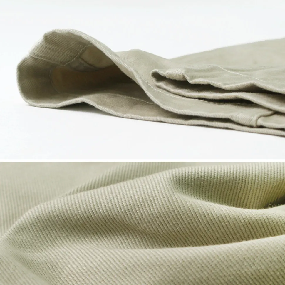 While typical chino is a twill weave woven with single yarns, this fabric is made with finer twin yarns.The high-density weaving of fine yarns creates a firm and strong fabric with a bounciness. The smooth, fine, flowing weave has a refined sheen and an outstanding atmosphere.