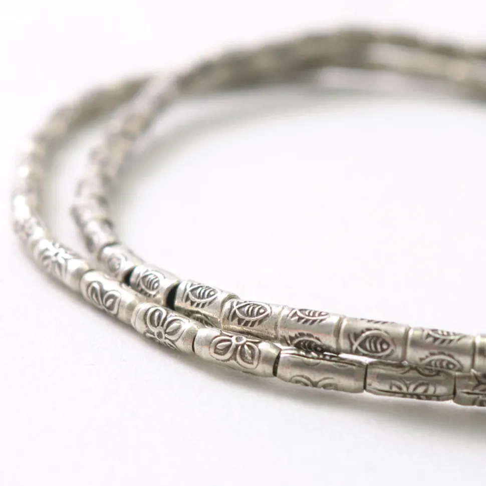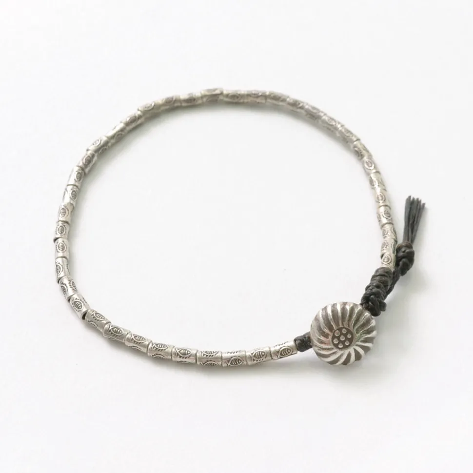 A Karen silver anklet with beautiful patterns inspired by fish and flowers. Handcrafted, each Karen silver bead used in this anklet has a unique expression.