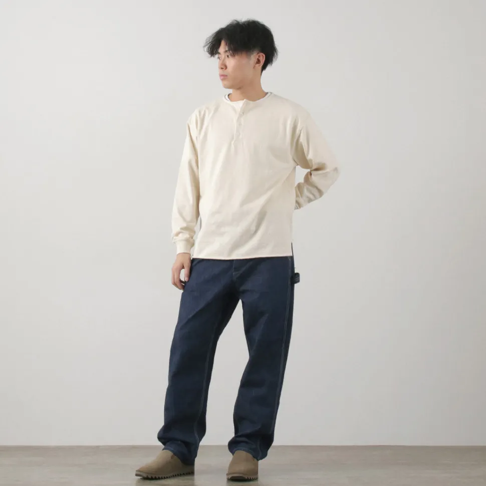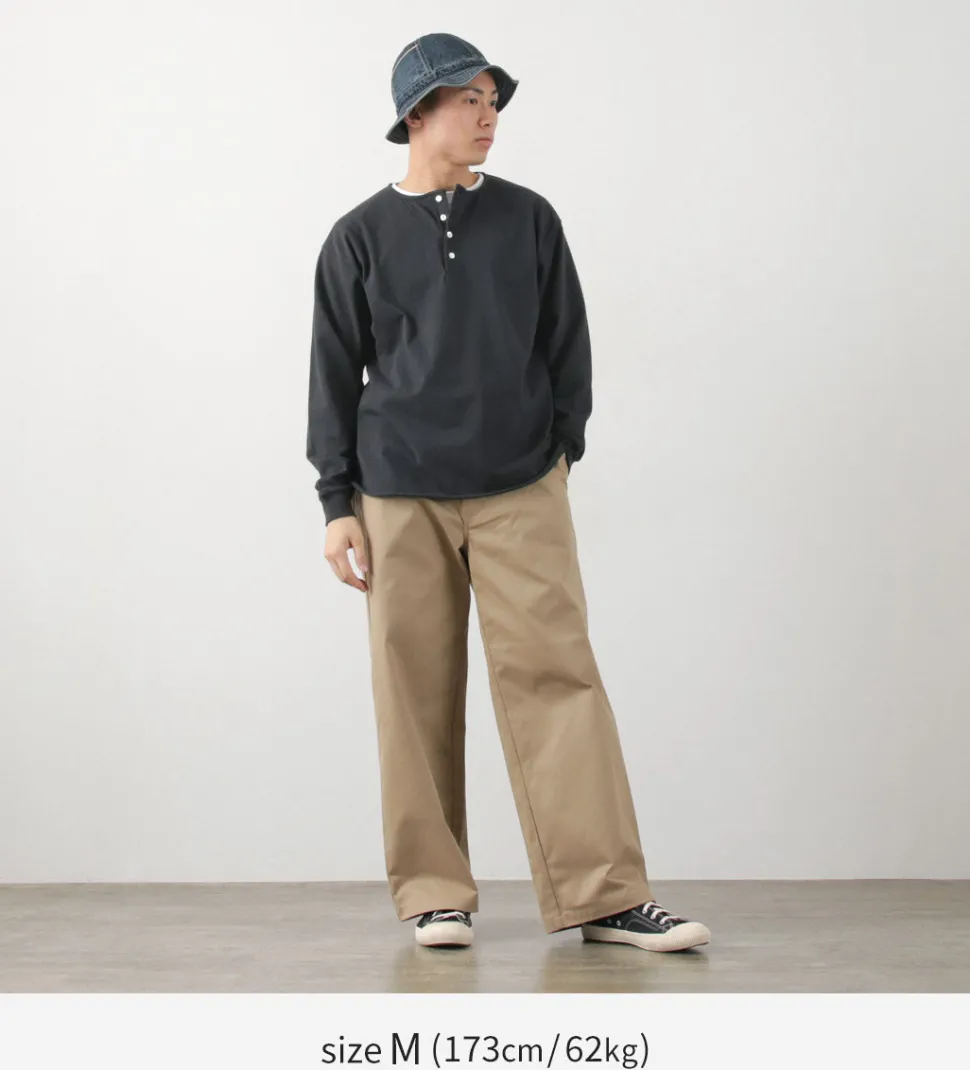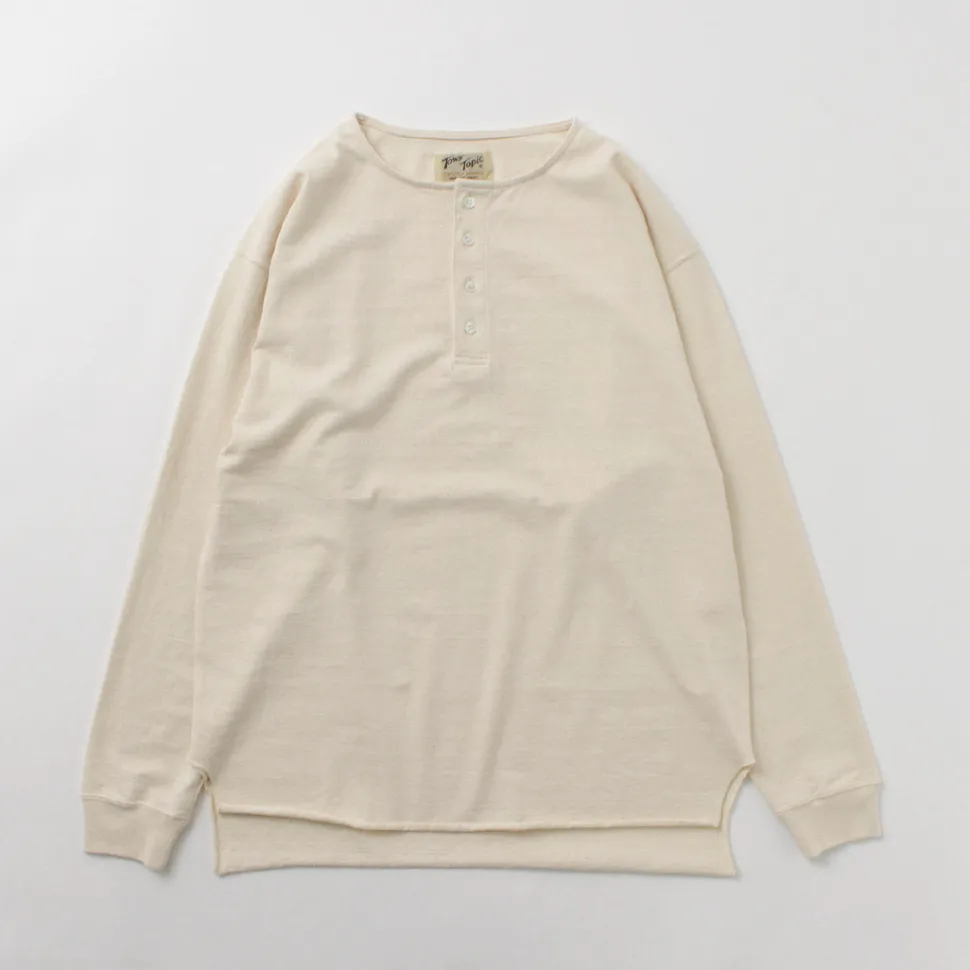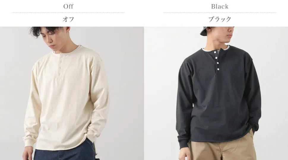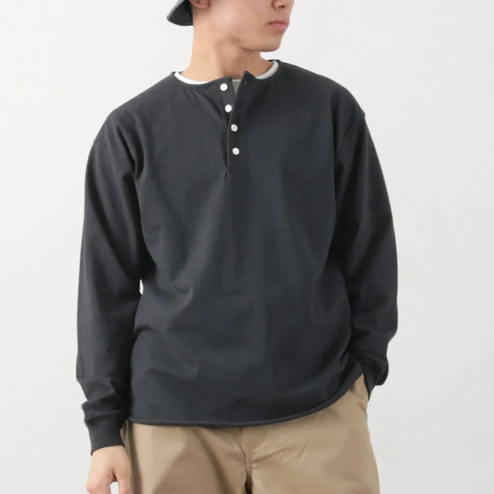 The fabric is made of jersey fabric with a rough feel, giving it an attractive vintage look. The classic henley neck is fully closed, of course, but the second button is set a little higher so that it can be worn with one button undone, and this is a piece that shows attention to detail.