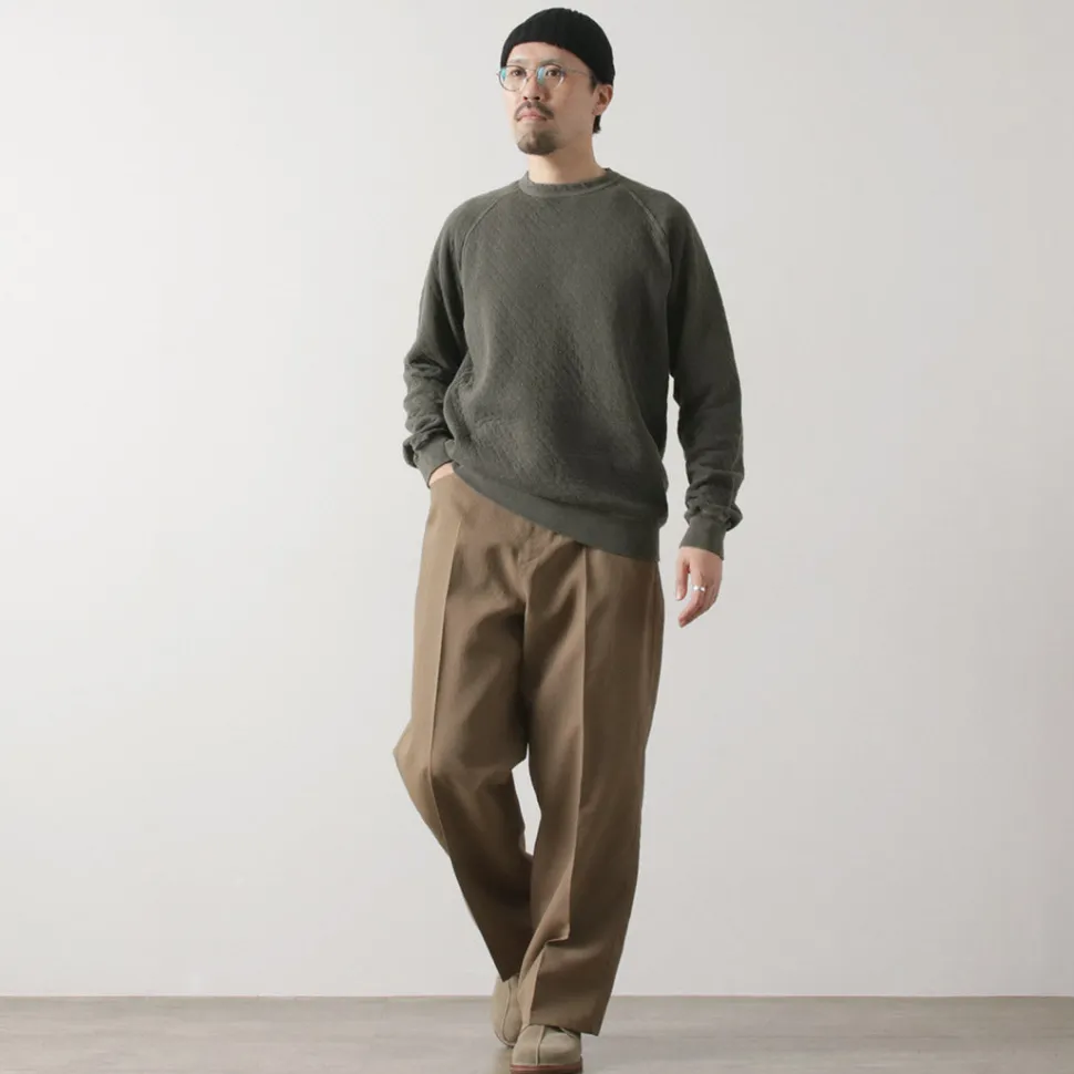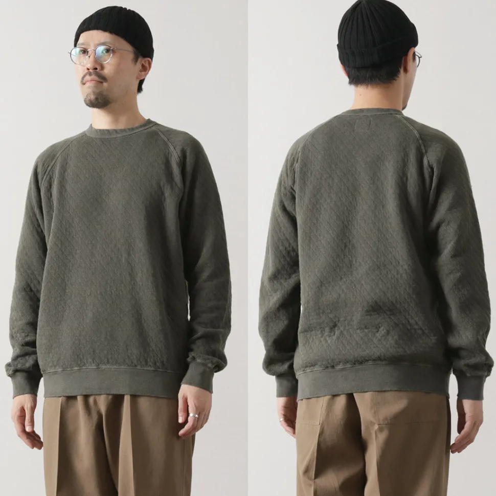 This quilted sweatshirt is made from a bundle of stretchy threads containing Photoelectron (R), which are fixed in a diamond pattern. It has been treated with a pigment dye process that gives it a unique vintage feel that only gets better with each wash, making it a sweatshirt you’ll want to grow with.