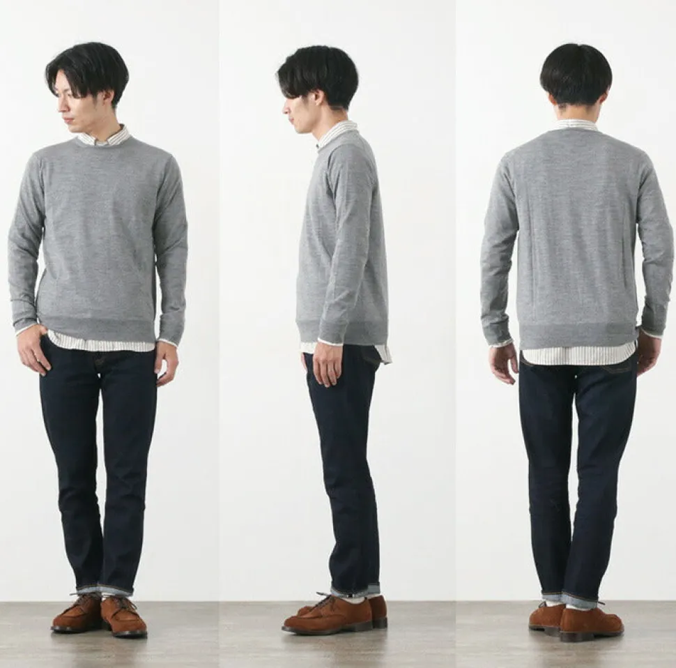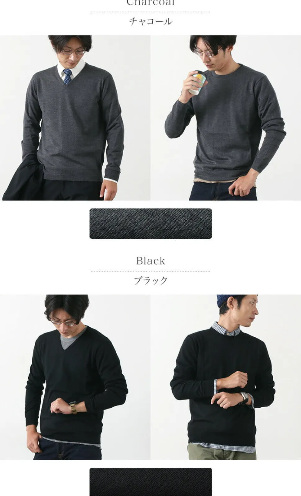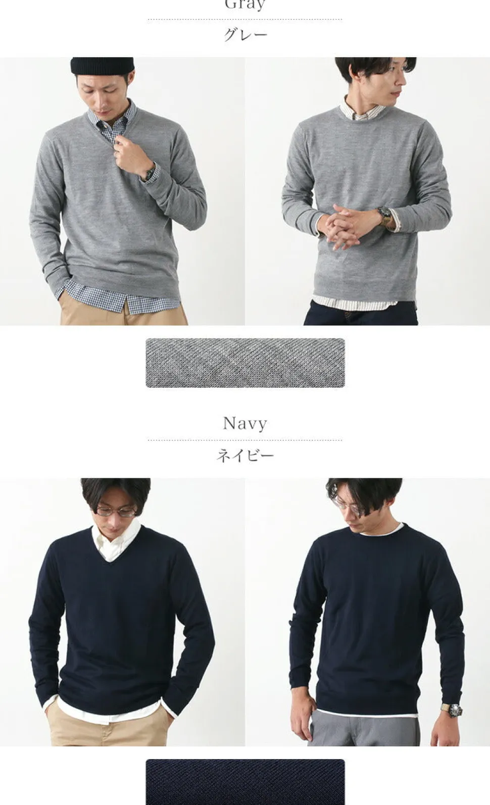 High gauge knitwear with confidence If a design is to be worn for many years, it must be made of the right materials, knitting, silhouette and finish. With this concept in mind, ROCOCO is proud to present this high gauge knit. Simple “crew neck” and “V-neck” designs in elegant materials for on and off-duty use. It is ideal for both casual and business use. Elegant and comfortable top-grade merino woolThis knitwear is made from 100% Australian “Extra Fine Merino”. It has an elegant lustre and good colour, which are essential for knitwear. In addition, it has a supple and gentle texture and is very comfortable to wear, with no stinging.
