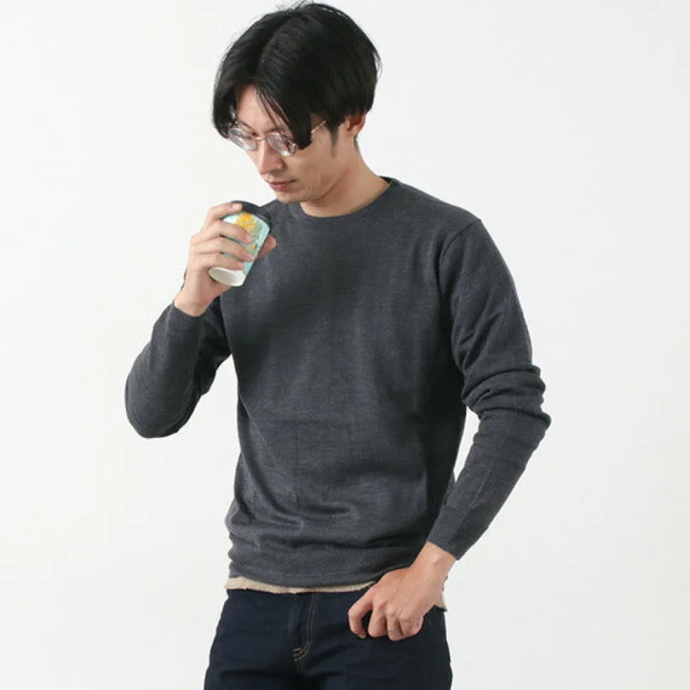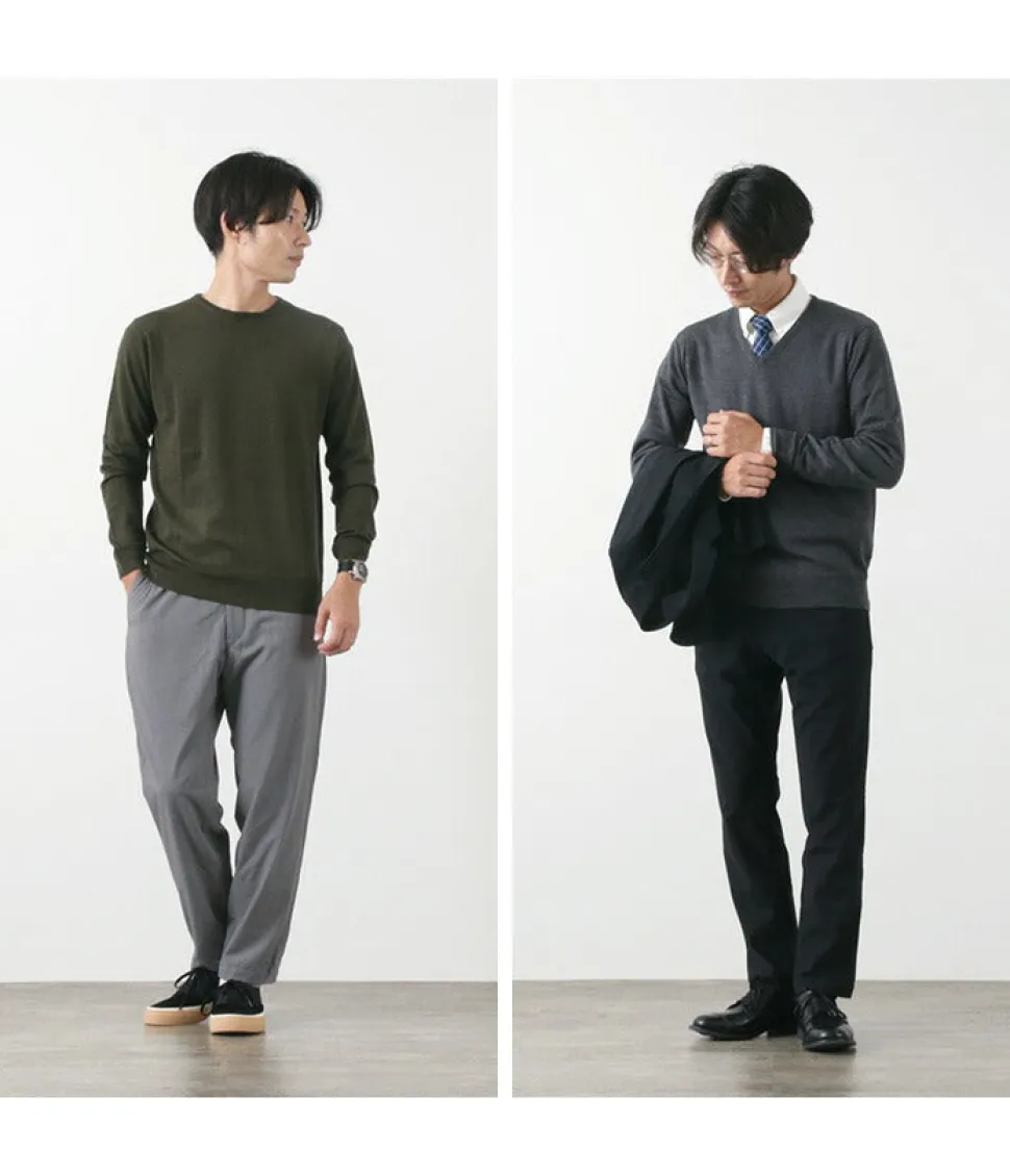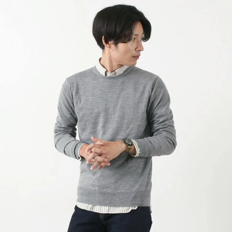 High gauge knitwear with confidence If a design is to be worn for many years, it must be made of the right materials, knitting, silhouette and finish. With this concept in mind, ROCOCO is proud to present this high gauge knit. Simple “crew neck” and “V-neck” designs in elegant materials for on and off-duty use. It is ideal for both casual and business use. Elegant and comfortable top-grade merino woolThis knitwear is made from 100% Australian “Extra Fine Merino”. It has an elegant lustre and good colour, which are essential for knitwear. In addition, it has a supple and gentle texture and is very comfortable to wear, with no stinging.